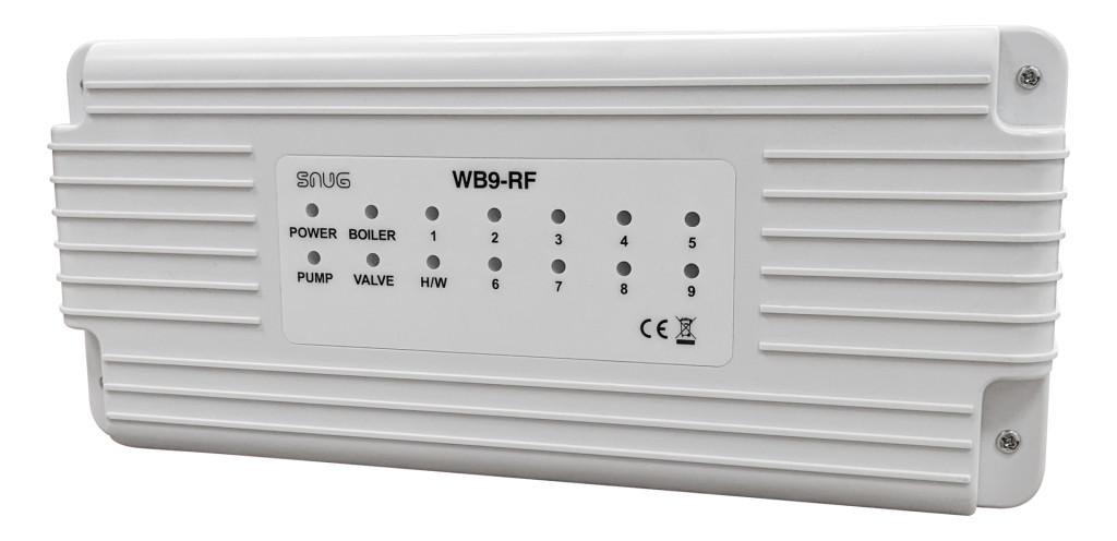 The Snug RF Wireless Wiring Centre is a 9 zone wireless wiring centre and is designed to work with SnugStat RF Wireless Wi-Fi thermostats, giving installers a totally wireless solution. It provides central switching and is therefore ideally situated next to the underfloor heating manifold. 9 zones can be controlled as well as providing an output for a hot water cylinder. At the same time the WB9-RF offers the ability to operate a boiler or other heat source through a volt free output with changeover contacts, which gives you both a heat on signal and a heat off signal. Up to 9 actuators can be connected to each zone.